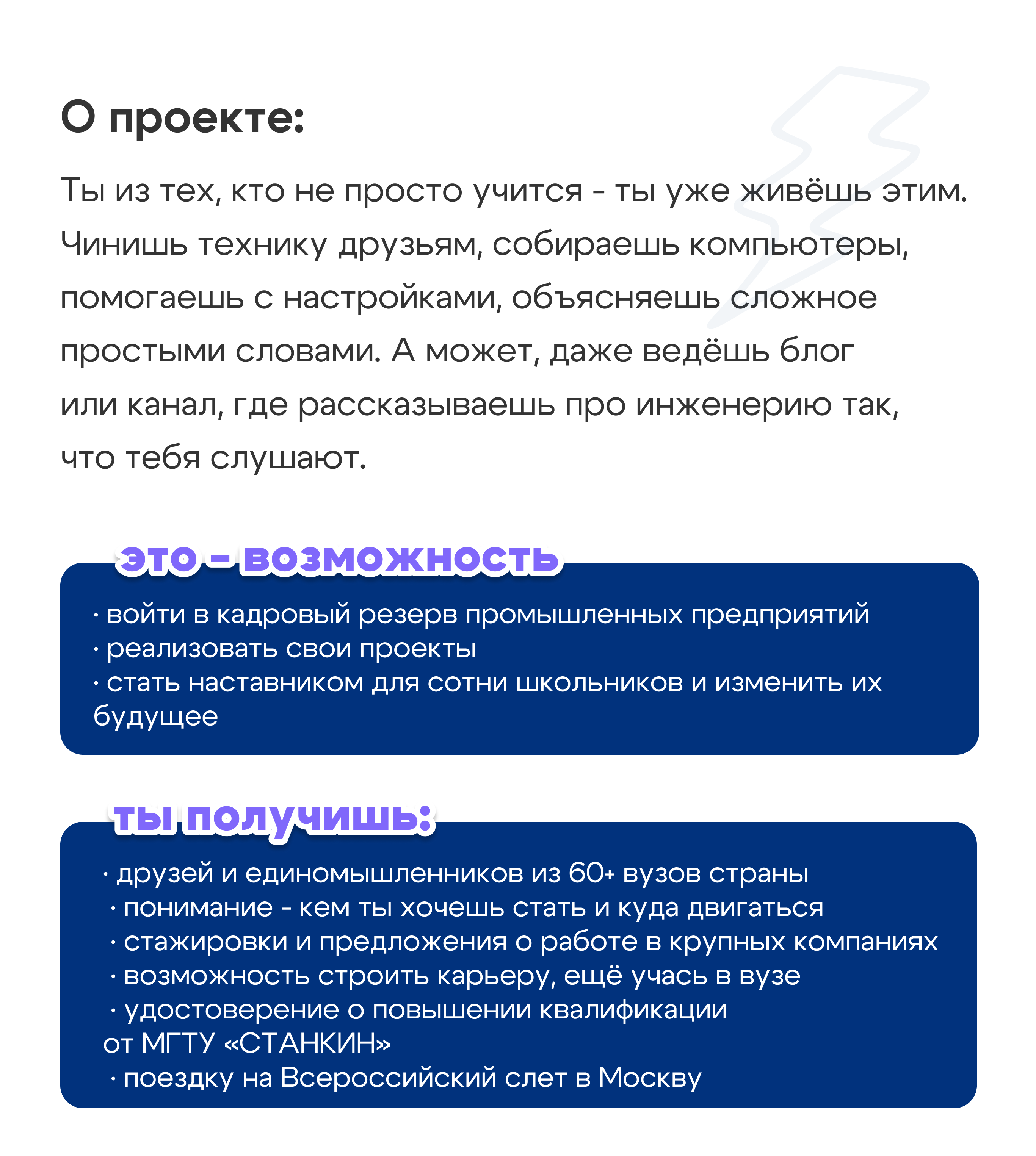 ШКОЛЬНИКУ: получить помощь при выборе профессии и будущего места учебы; улучшить свои знания по предметам естественно-научной направленности; получить помощь при подготовке к конкурсу или олимпиаде технической направленности; повысить свои шансы на поступление в вуз.